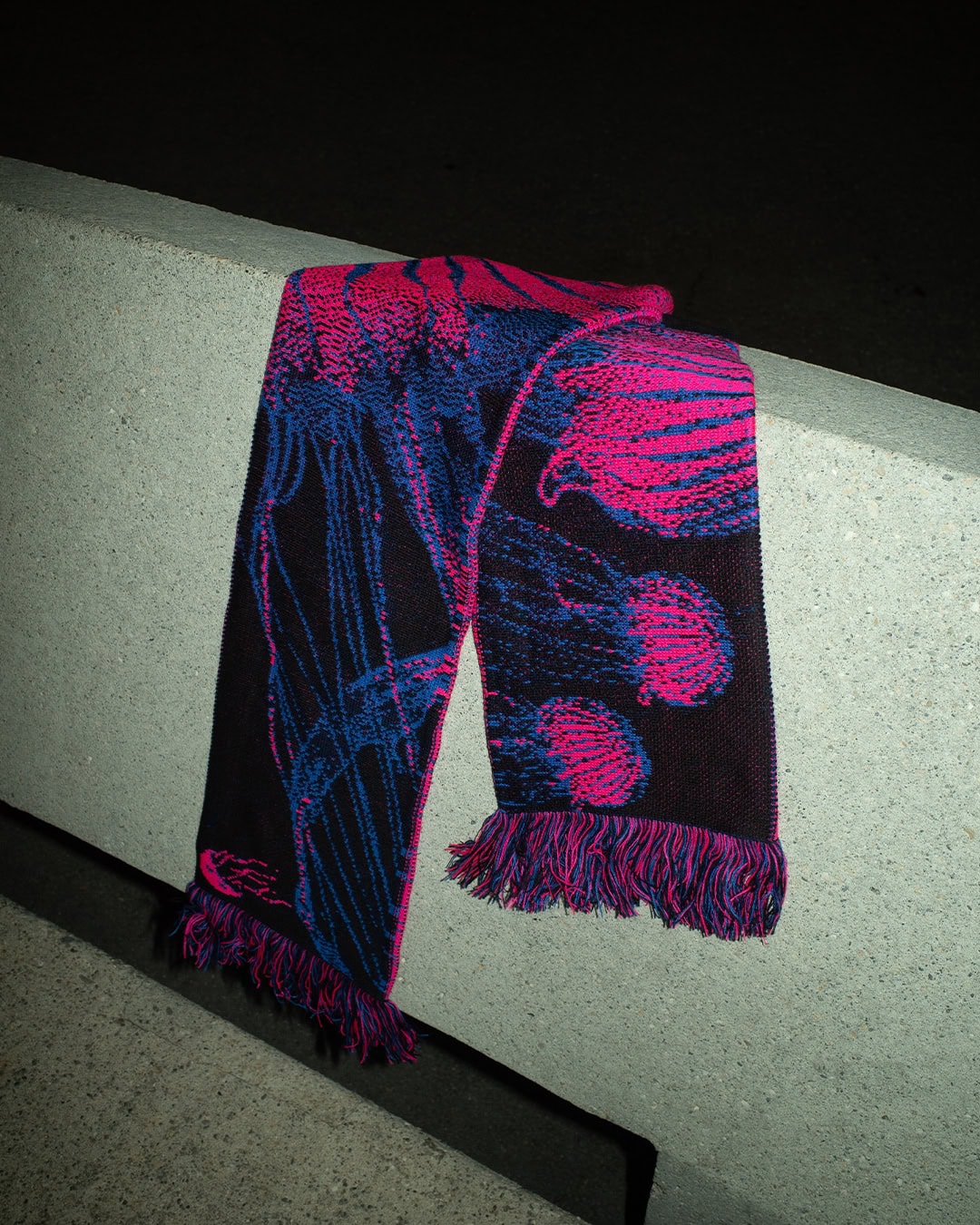 This scarf explores contrast as a visual language, directly inspired by the movement of jellyfish. Vibrant pink and deep blue intertwine in a graphic pattern that evokes their pulsing motions. The forms appear to glide across the surface translating a sense of suspension.